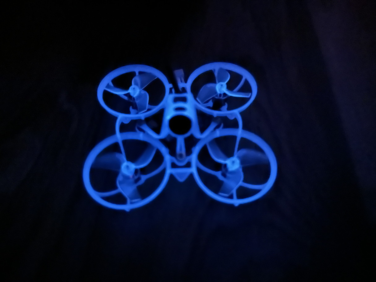 Der ganze Frame besteht aus einem bläuliche florierenden Material, bei BetaFPV nennt man es Ghostly Blue Luminescence.