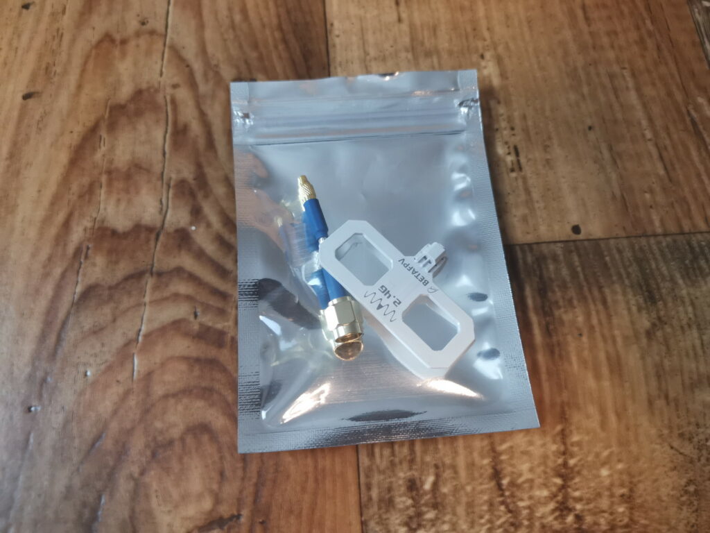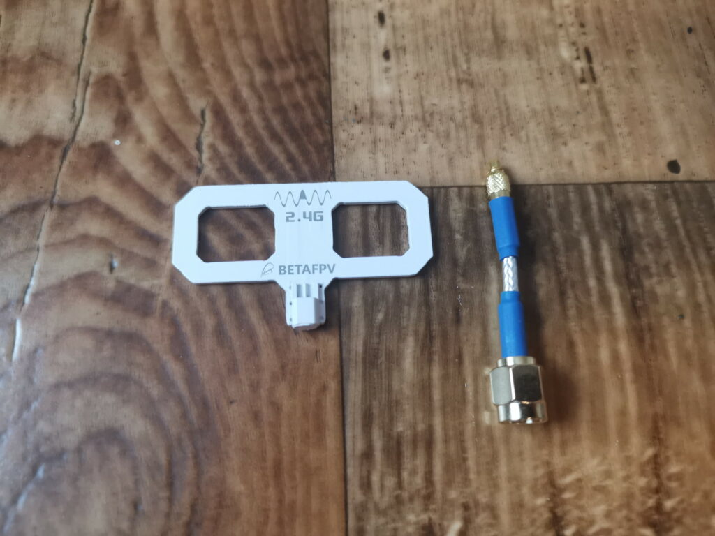 Eine kleine Verlängerung mit einem SMA Stecker und einer MMCX Buchse verbindet die Moxon mit dem BetaFPV Nano TX ELRS.