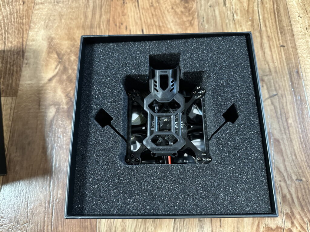 Unter bzw. im Schaumstoff findet man den fast fertig aufgebauten Cinewhoop.