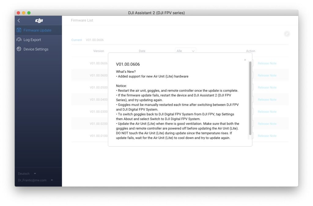 Seit gestern (27.07.21) ist das Update V01.00.0606 für die DJI FPV Produkte verfügbar.