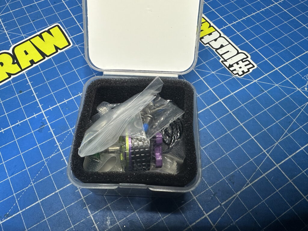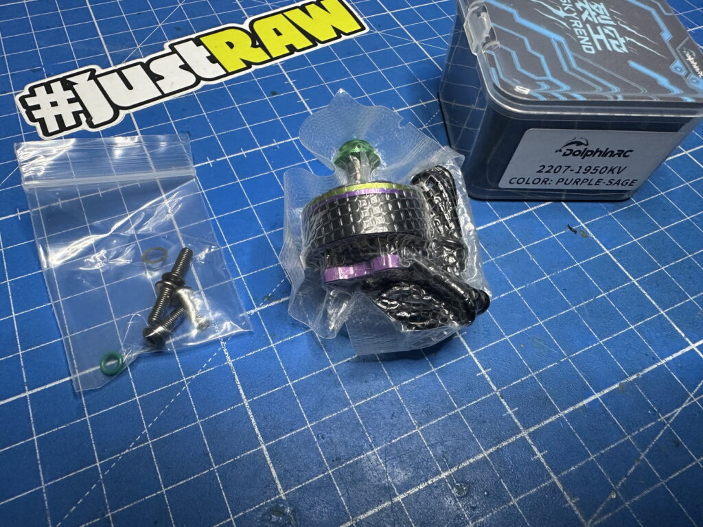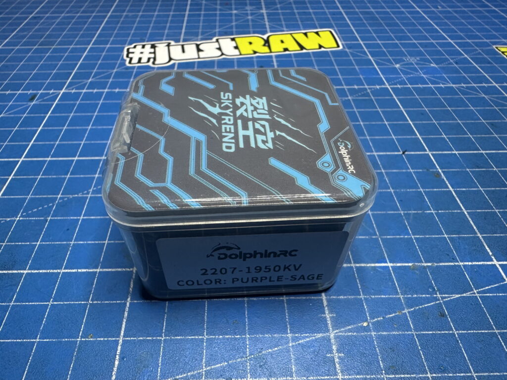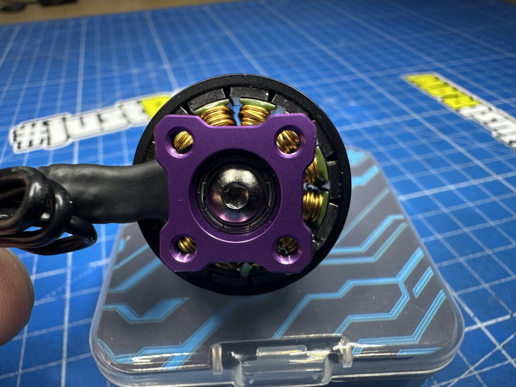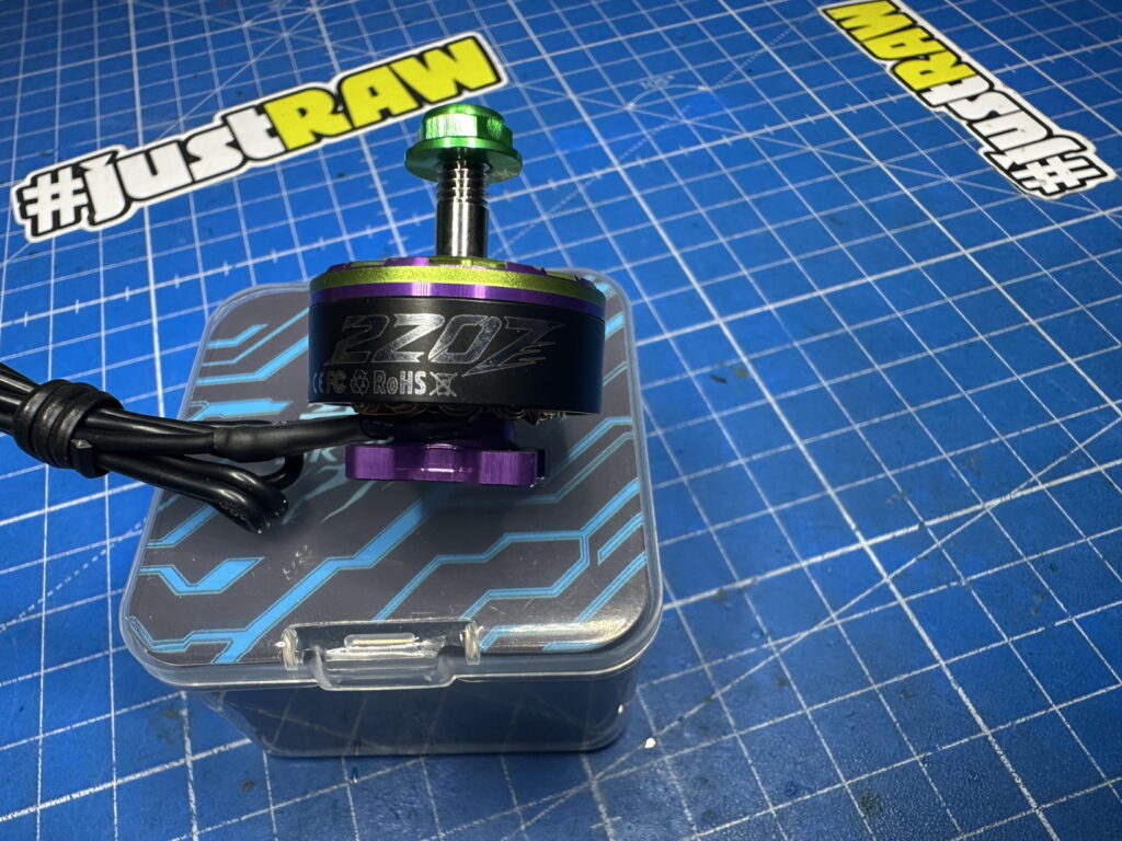 Es handelt sich um einen typischen 5-Zoll-Motor in der Größe 2207 mit einer KV von 1950, der jedoch auch mit 2100KV erhältlich ist. Zudem gibt es ihn in zwei verschiedenen Farbvarianten: klassisch in Schwarz-Rot oder in meinem Fall in Purple Sage.