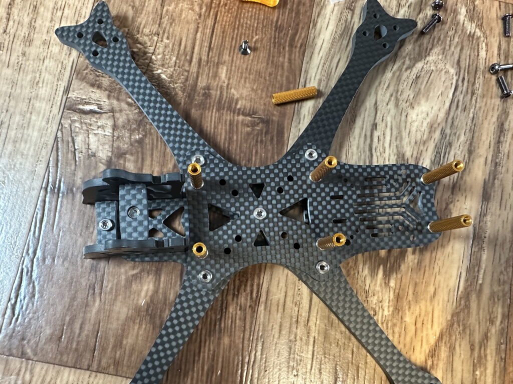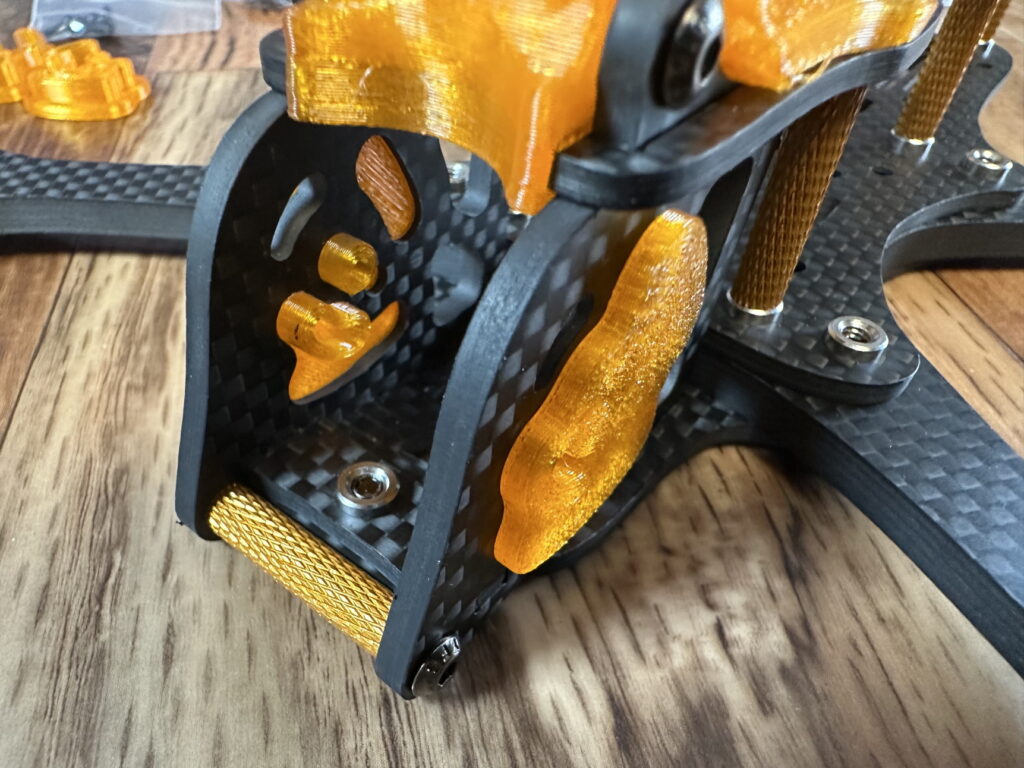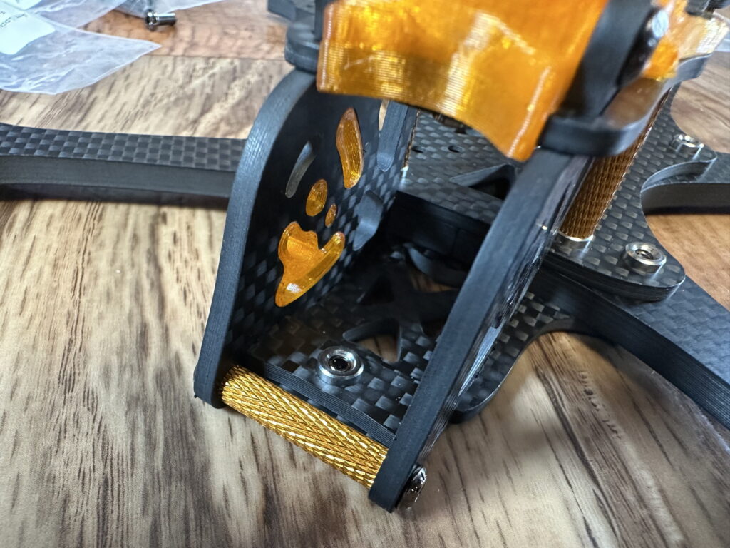 Er wird vorne über den Standoff gehalten und bittet zudem um einen zusätzlichen kleinen Schutz für die FPV-Kamera.