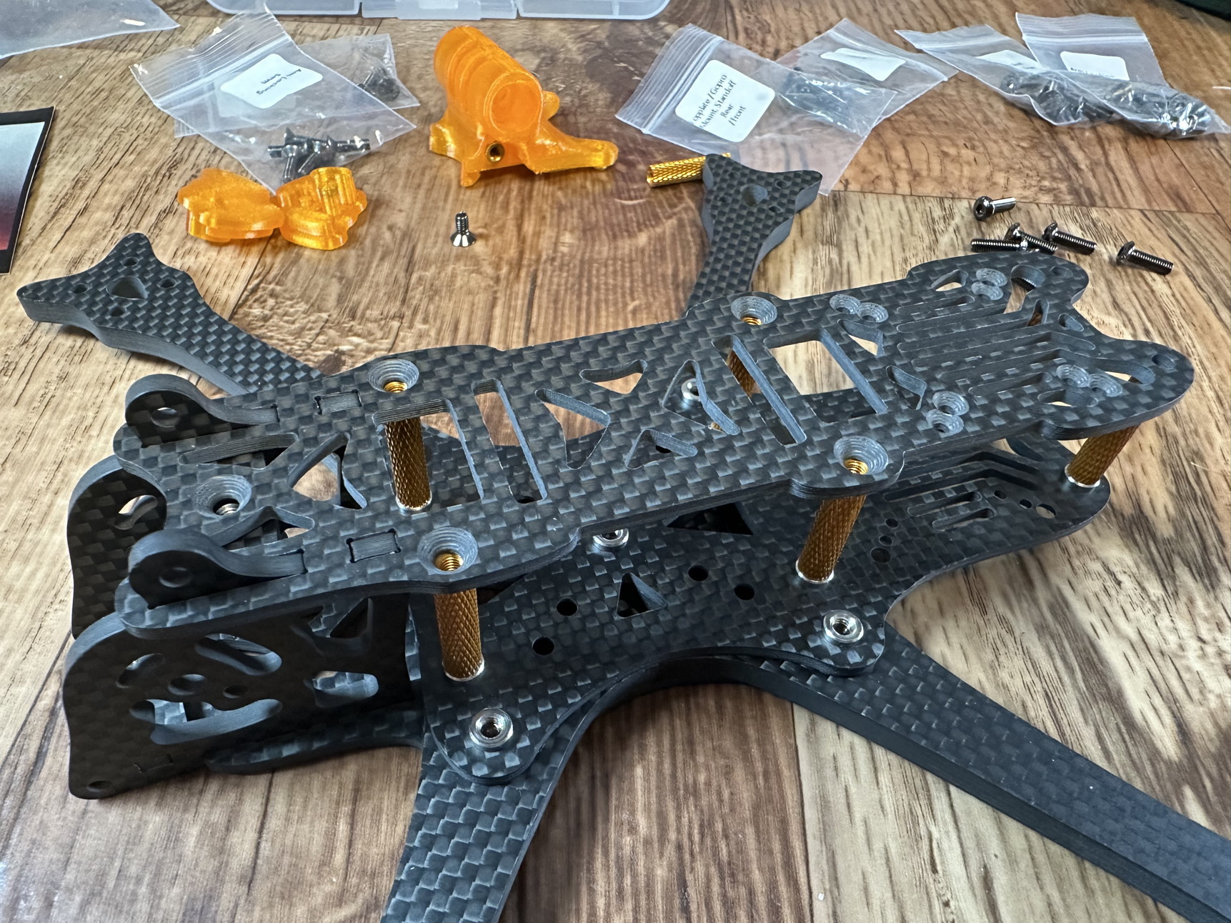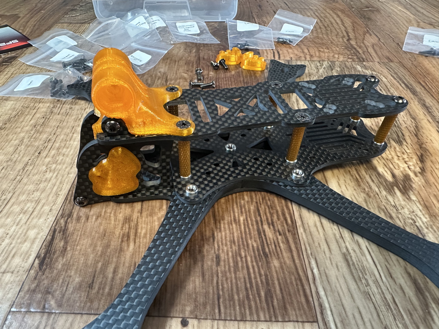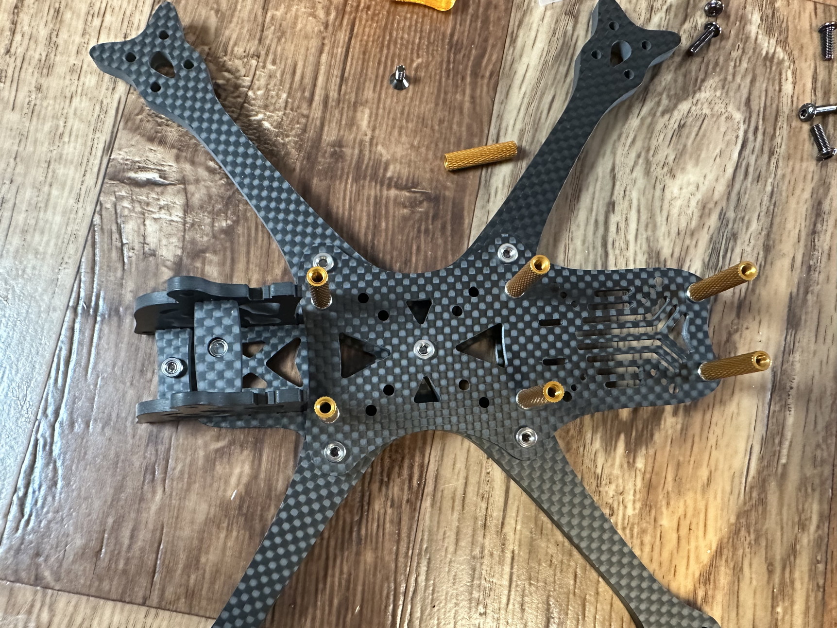 Beim Kameracage ist drauf zu achten, dass die beiden kleinen Carbonplatten mit der Einpressmutter verbaut werden.