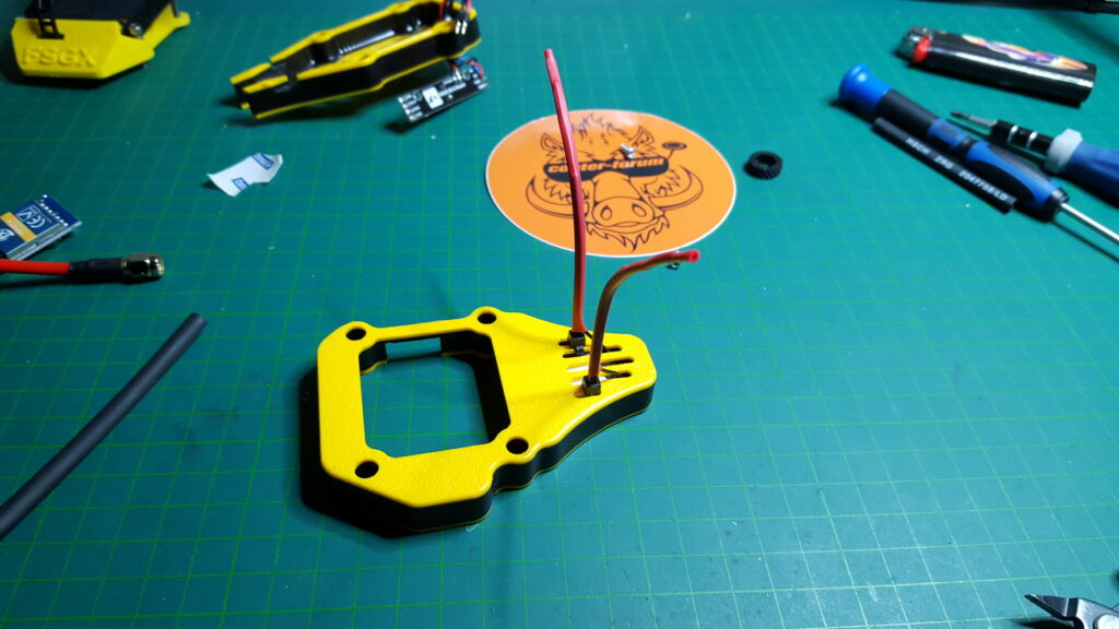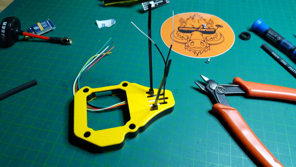 Dann habe ich den FPV Sender erstmal verschraubt, damit der nicht weiter am Tisch rum kullert.