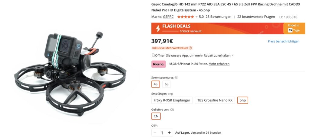 Akutell ist der GEPRC Cinelog35 HD mit Caddx Vista und PRO Kamera* für run 398 Euro im Sale auf Banggood.