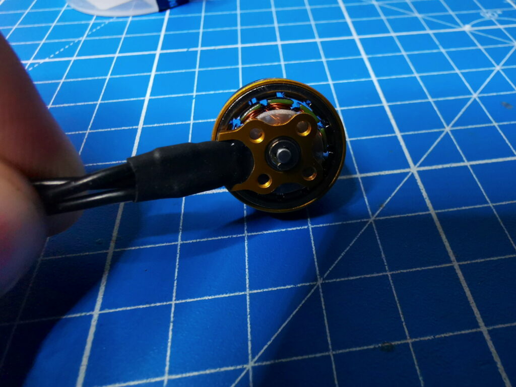 Der Motor hat drei 11cm lange Kabel, auch hat er einen kleinen Schutzbügel, damit wird verhindert, dass die Motorkabel an der Glocke schleifen können. Zusätzlich werden die 3 Kabel noch mit einem Schrumpfschlau in Position gehalten.