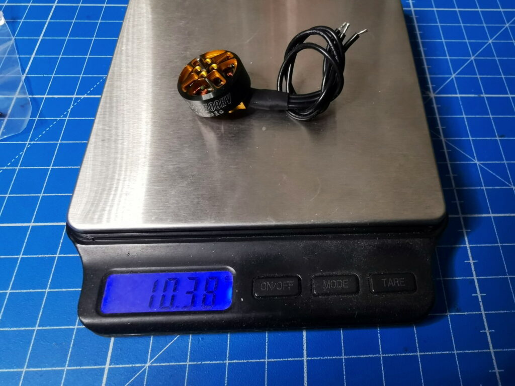 Der Motor mit voller Kabellänge bringt 10,38gr. auf die Waage. HGLRC selbst, gibt die Motoren mit 11gr. an.