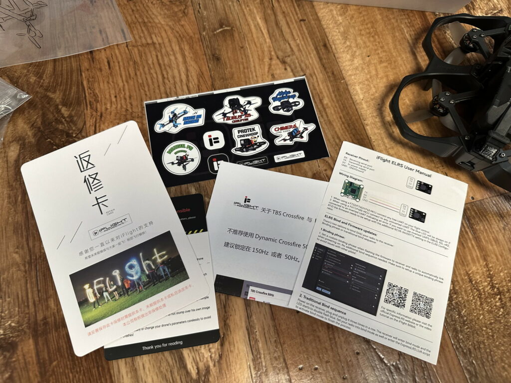 Eine Karte von IFlight, Kurzanleitung für ERLS, Hinweis für 150Hz preset bei TBS Crossfire, allgemeiner Hinweis zum Vorsichten Fliegen. So wie ein mehrteiliger Stickerset.