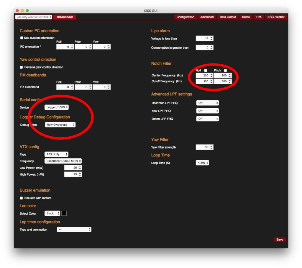 Jetzt muss man der KISS Software noch sagen, dass ein Logger dran hängt und die Notchfilter deaktivieren.