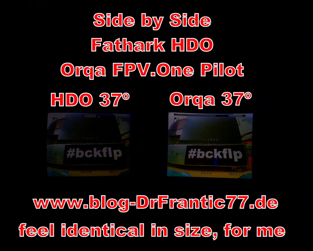 Dazu habe ich die HDO (V1) verwendet, die auch mit 37º angegeben wird. Wenn ich durch die Brille schau, empfinde ich beide Bilder gleich groß. Was ja auch die technischen Daten, so wiedergeben.