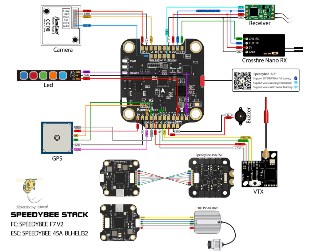 Zum Schluss noch das Wiring Diagram von der Speedybee Seite, hier kann man auch nochmal die bereits erwähnte durchdachte Anordnung der Lötpads erkennen.