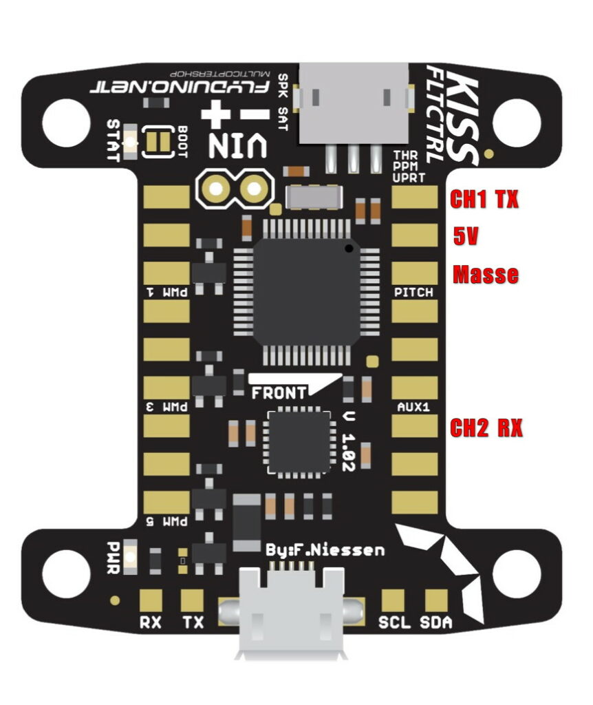 TX wird auf den PPM/SBUS gelötet, von hier nimmt man am besten auch gleich die 5V mit. RX wird dann auf AUX1 gelötet.