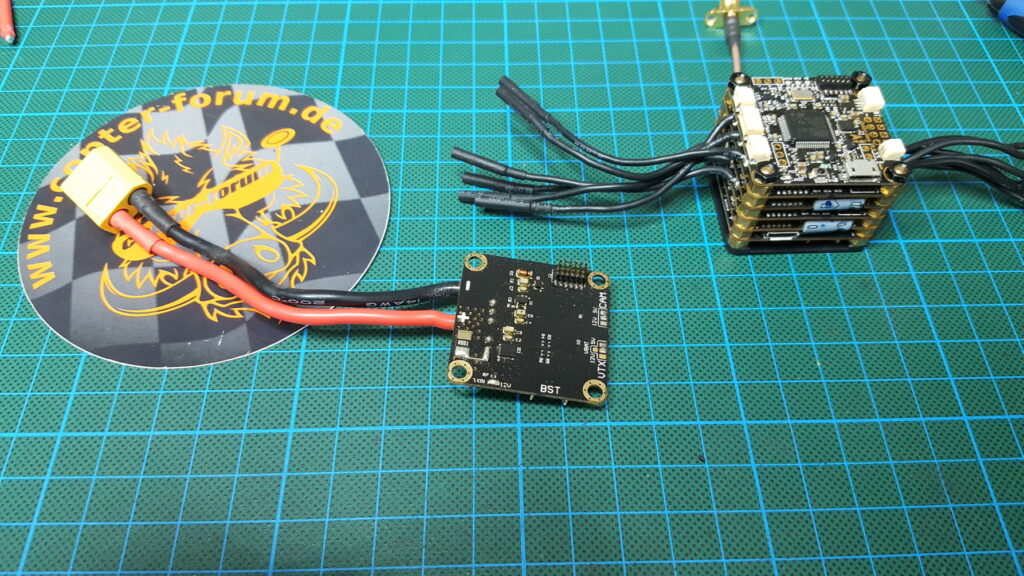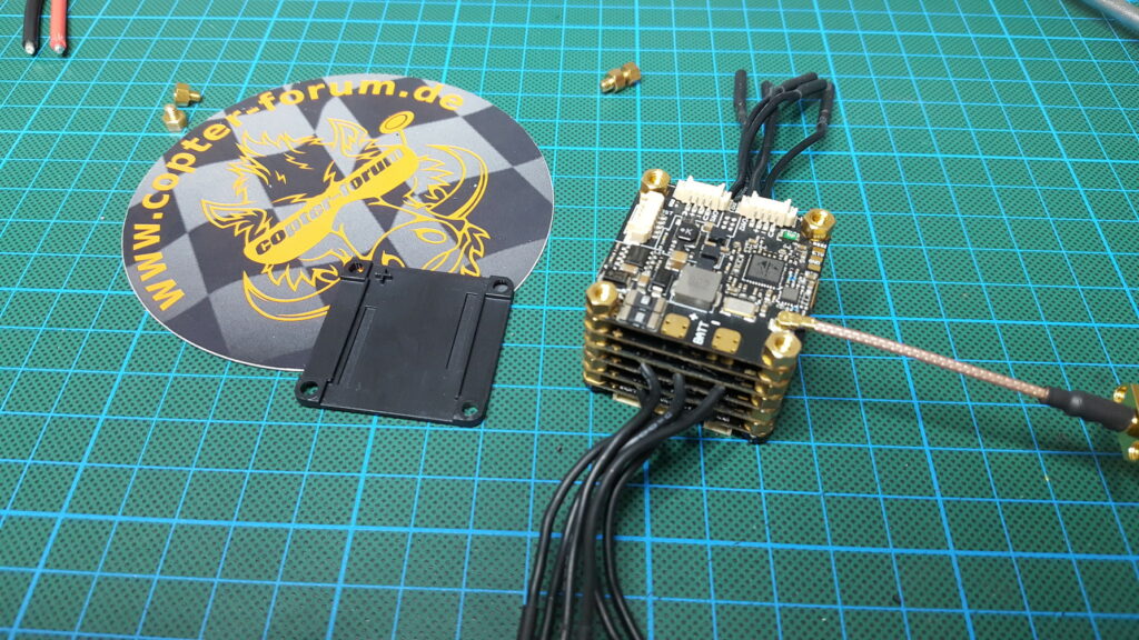 Jetzt muss nur noch das XT60 Kabel angelötet werden und der Kunststoffdeckel verschraubt werden. Darauf achten, das das Kreuz unter VTX Antenne liegt.