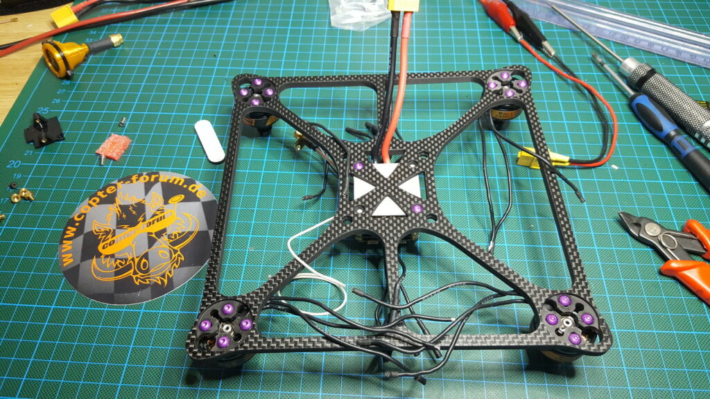 Die Motorkabel habe ich auf der Oberseite des Frames verlaufen lassen. Die 2 mm Goldkontakte habe ich abgezwickt und die Kabel direkt zusammen gelötet.