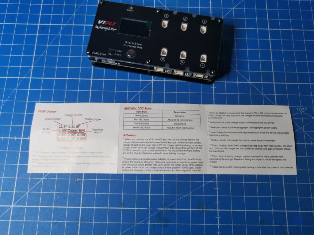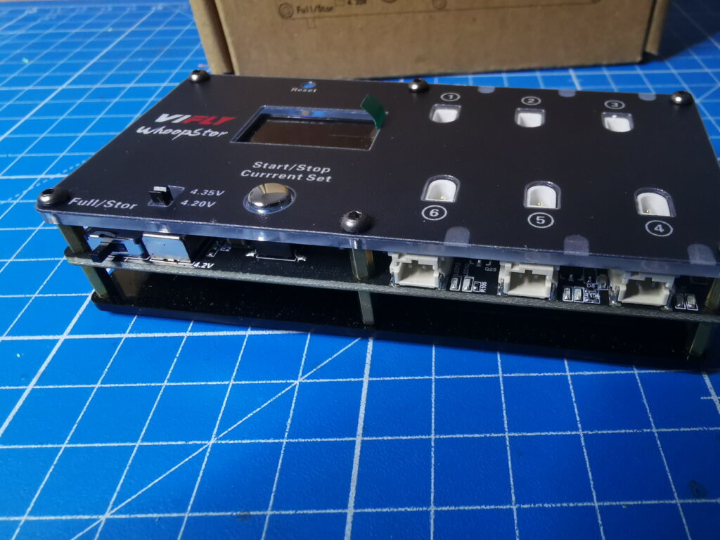 Achtung!!! Der WhoopStor kann leider nur bis 5S (7V – 21V) was leider ein wenig schade ist. 6S wären schon ganz nice gewesen. Vielleicht bessert hier ViFly nochmal nach. Der USB Stecker sollte mit einem passenden Ladegerät genutzt werden, vorzugsweise mit QC 3.0, damit hier die 9V bzw 12V anliegen können. Dies wird auch benötigt, da jeder Port bis maximal mit 0,9A befeuert werden kann. Bei 6 Ports brauchen wir also mindesten 5,40A.