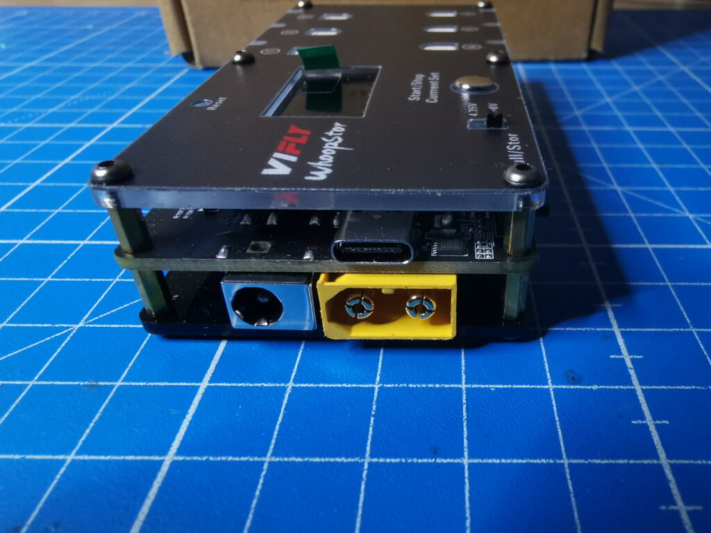 An der linken Seite, lässt sich der ViFly WhoopStor dann über einen XT60 oder DC RundStecker und USB-C mit dem Strom versorgen.
